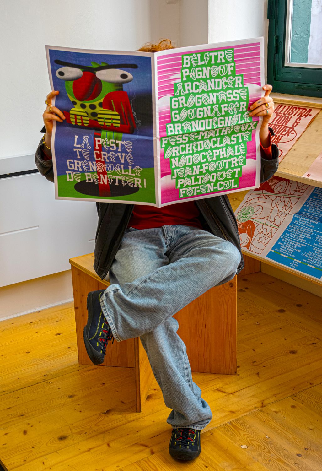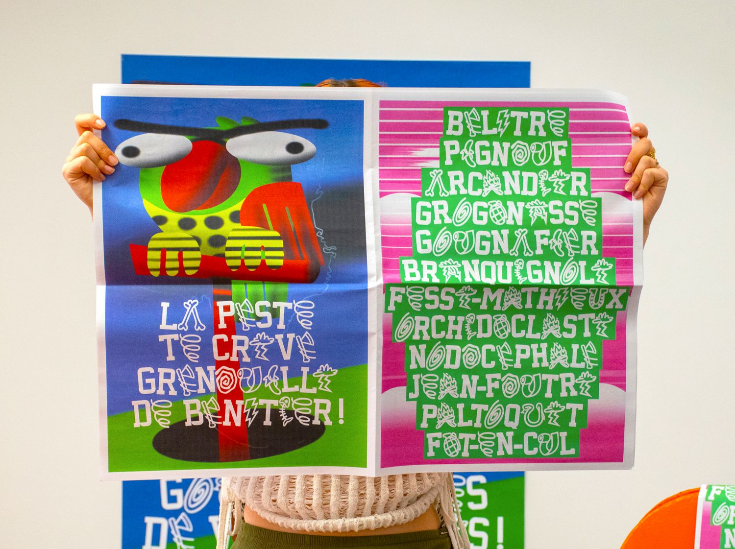 Dans le cadre des galeries d’essais et de son diplôme sur l’illustration subversive, Nathan Pauron est venu montrer son travail de typographie grossière « Arcandiers », prise entre lettre, image et bande dessinée.
