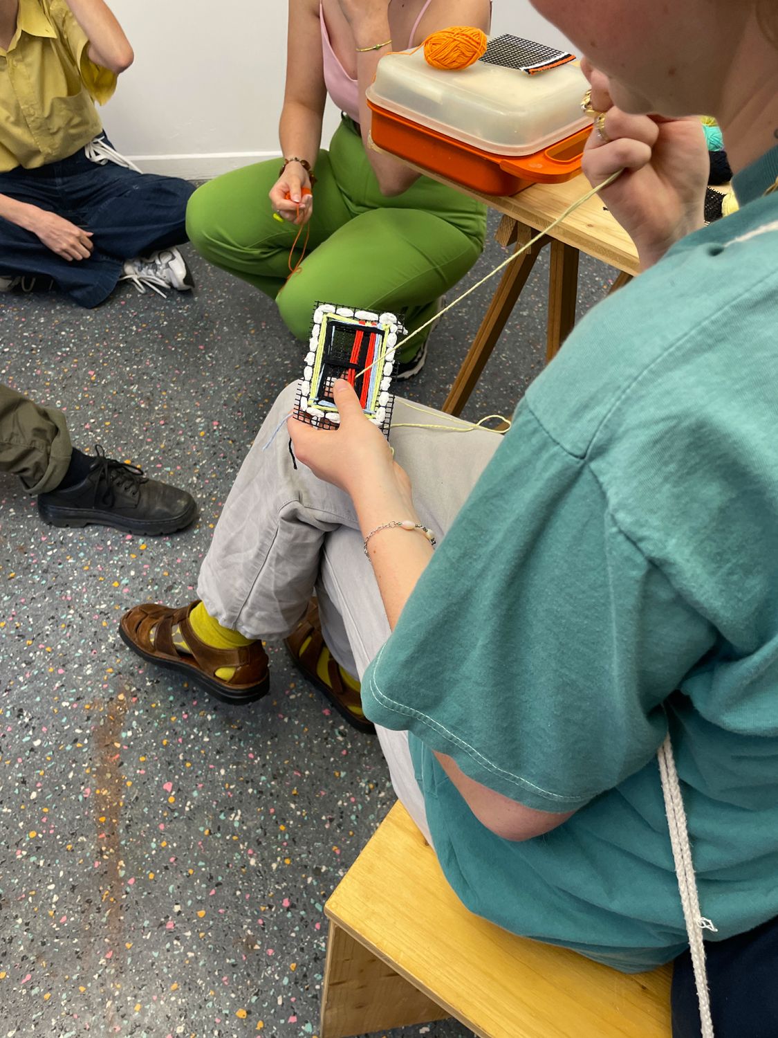 Dans le cadre des galeries d’essais, Coraline Hon est venue accrocher ses recherches colorées en hommage au fameux atelier textile et aux femmes du Bauhaus mais aussi animer une petite manufacture d’articulation de chaines et de trames de nuances de couleur.