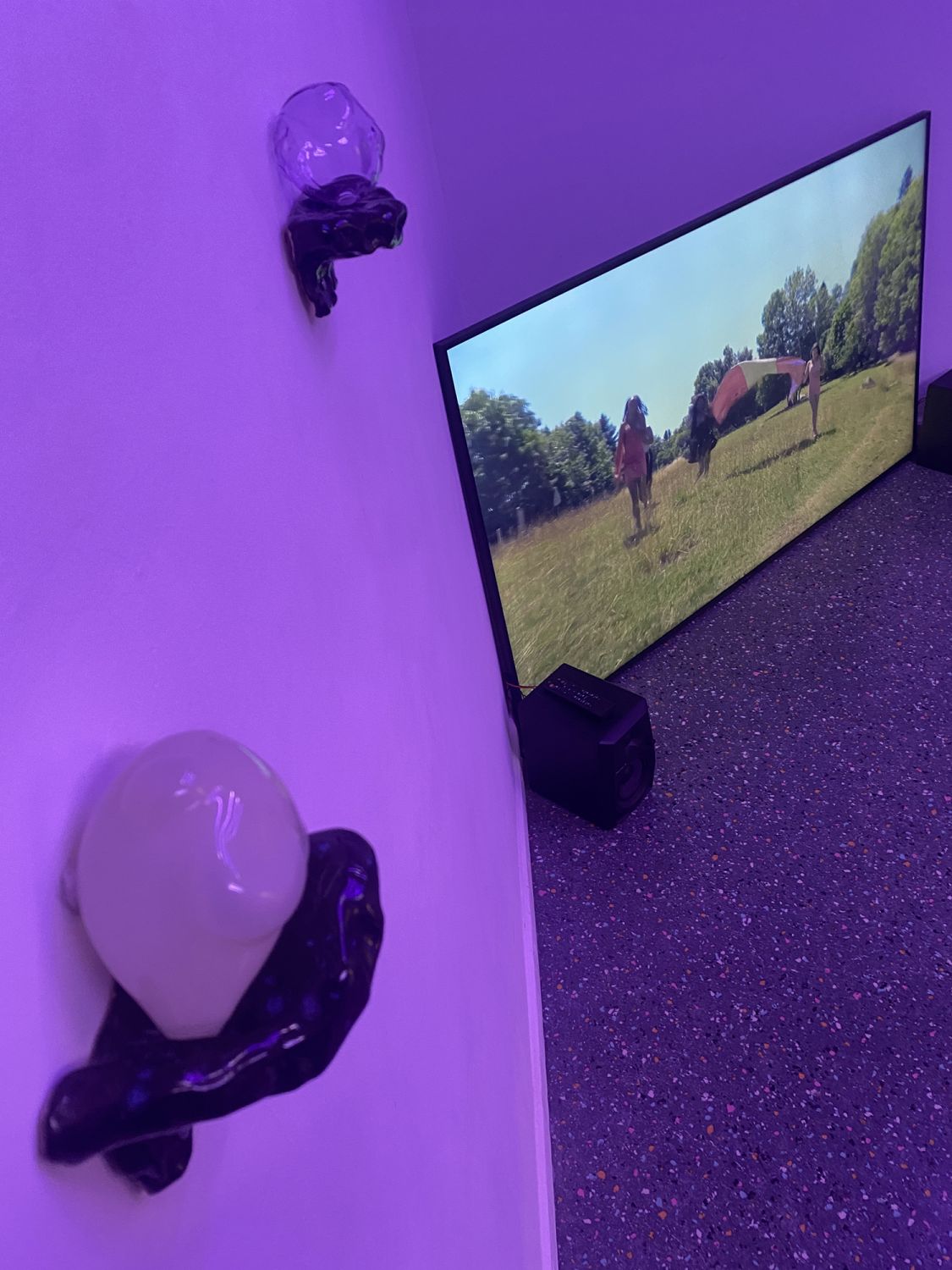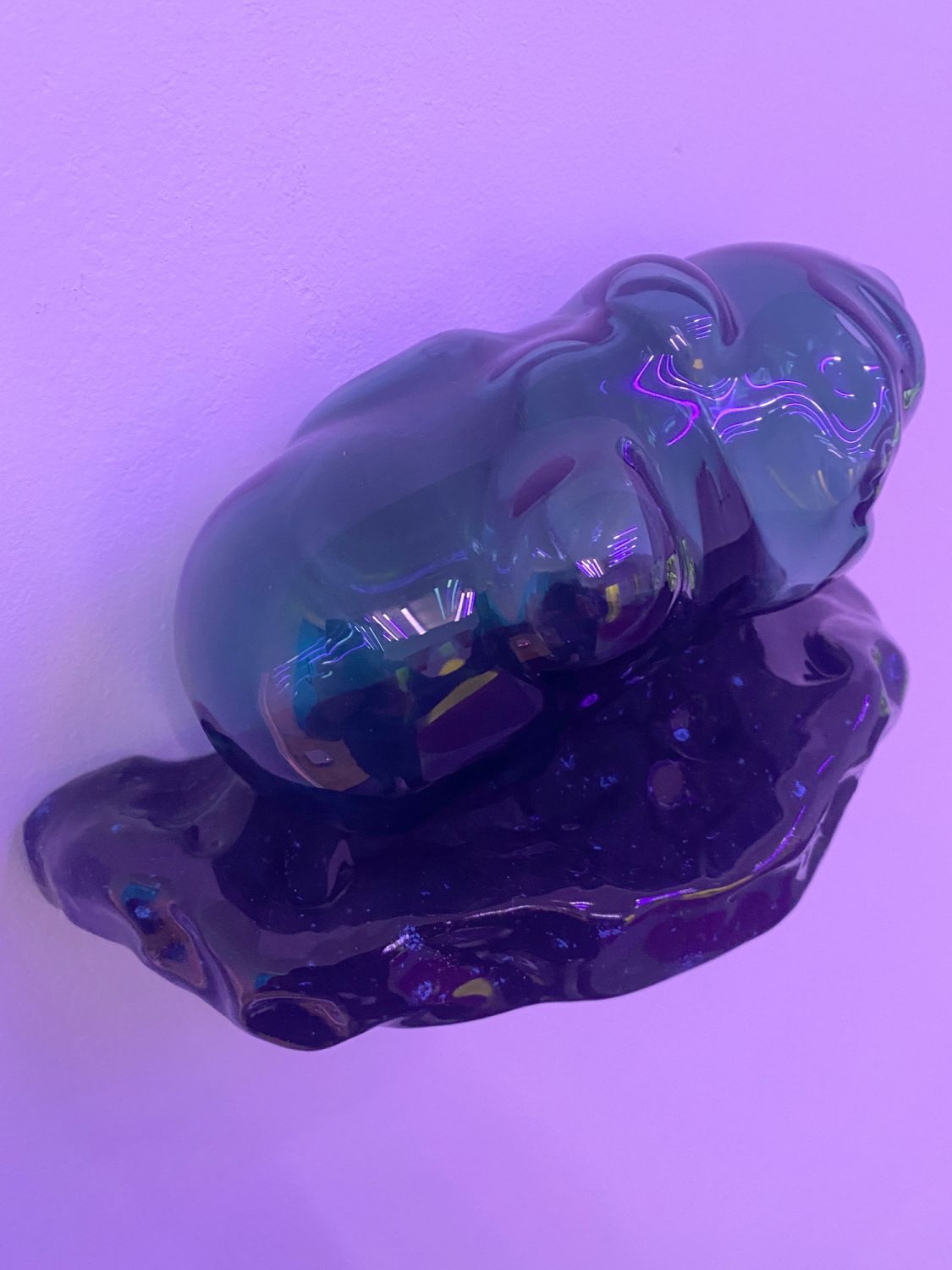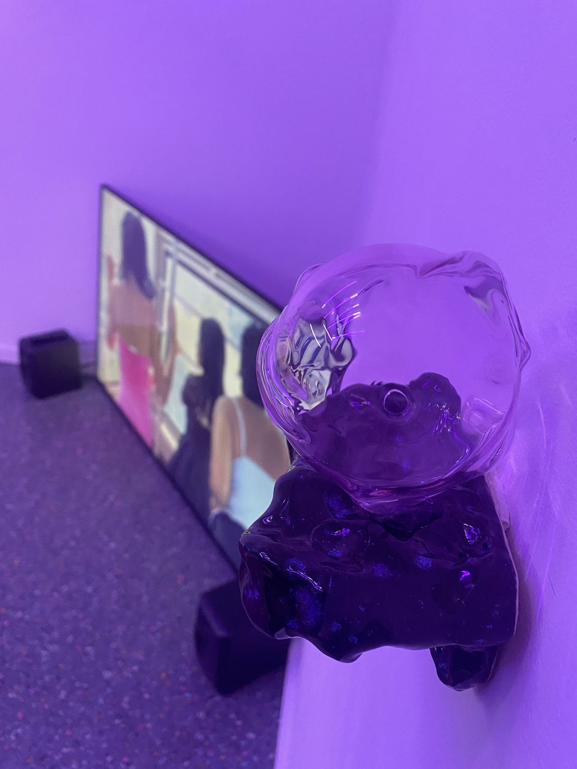 Tanaland ne représente pas seulement une utopie : c’est avant tout un acte de reprise symbolique, un renversement du stigmate, selon la formule sociologique consacrée. L’artiste traduit ce geste à travers une série de sculptures en verre soufflé aux couleurs vives, posées sur des supports en céramique noire. Quatre insultes misogynes — TANA, SALOPE, CONNE, PUTE et CONNASSE — sont soufflées lettre par lettre dans des formes arrondies en verre, réalisées avec l’aide de l’artisteHeloïse Colrat. Sous les souffles d’Auriane, ces formes se tordent et se métamorphosent, devenant de véritables empreintes matérielles d’un processus de transformation symbolique. C’est comme si ces mots hostiles se vidaient de leur substance, de toute leur charge négative, jusqu’à devenir un souffle pur, sorte de langage avant le langage. Les mots cessent alors d’obéir au sens, et affectent le corps pour devenir une expérience sensorielle libératrice.
