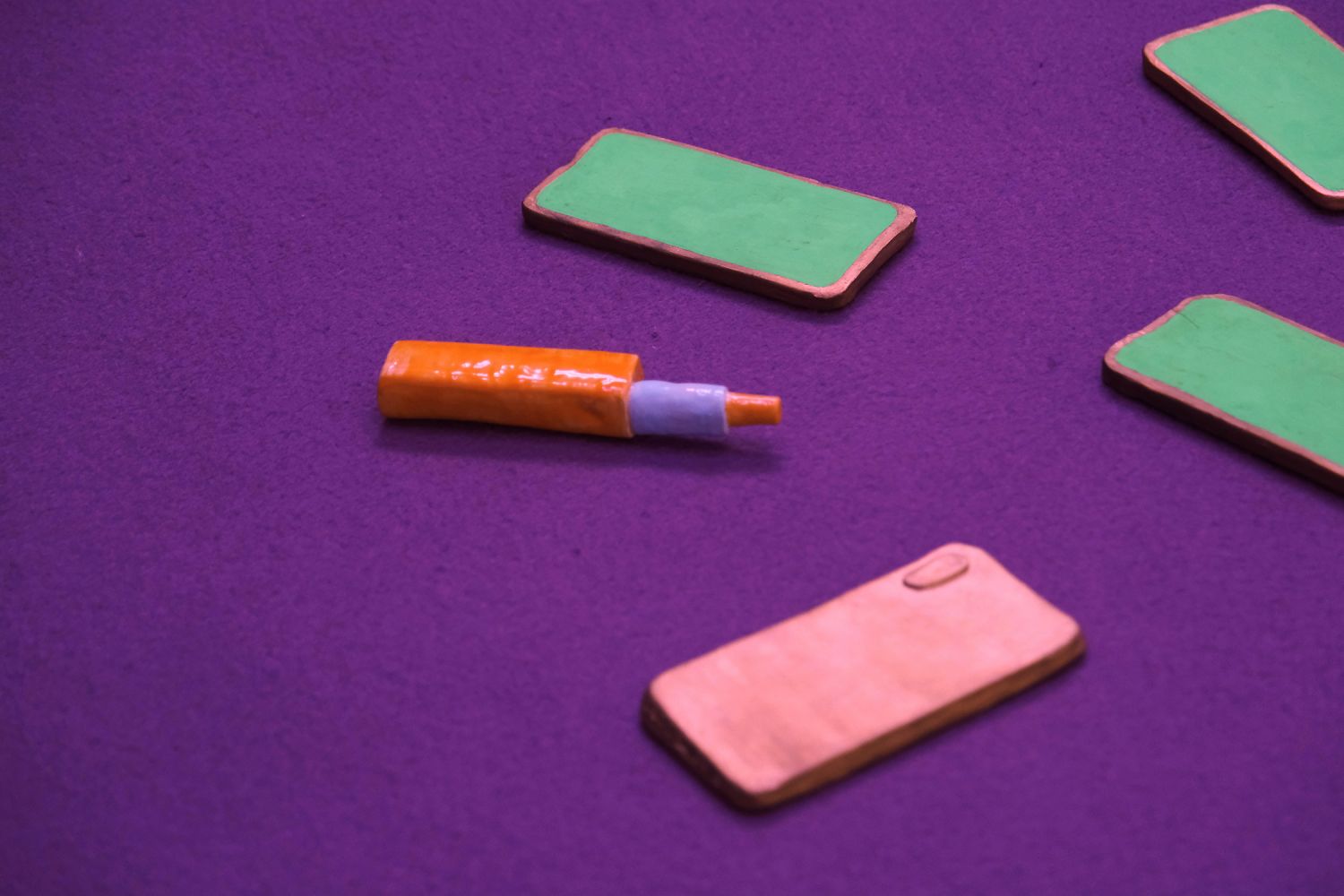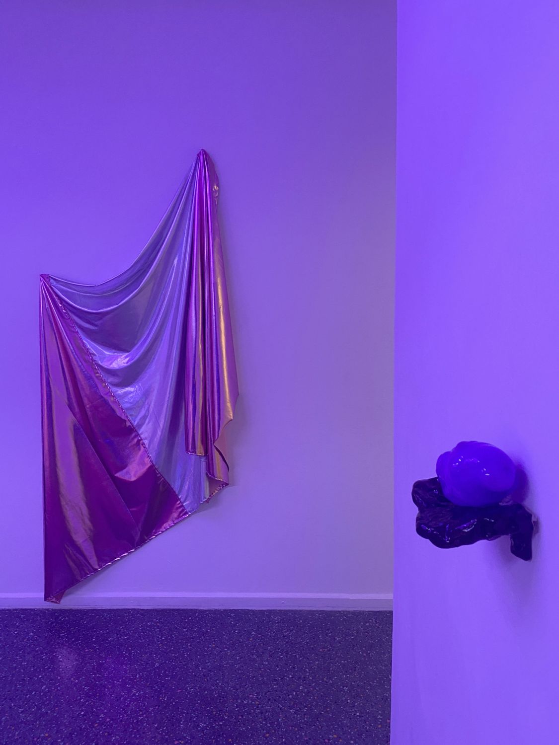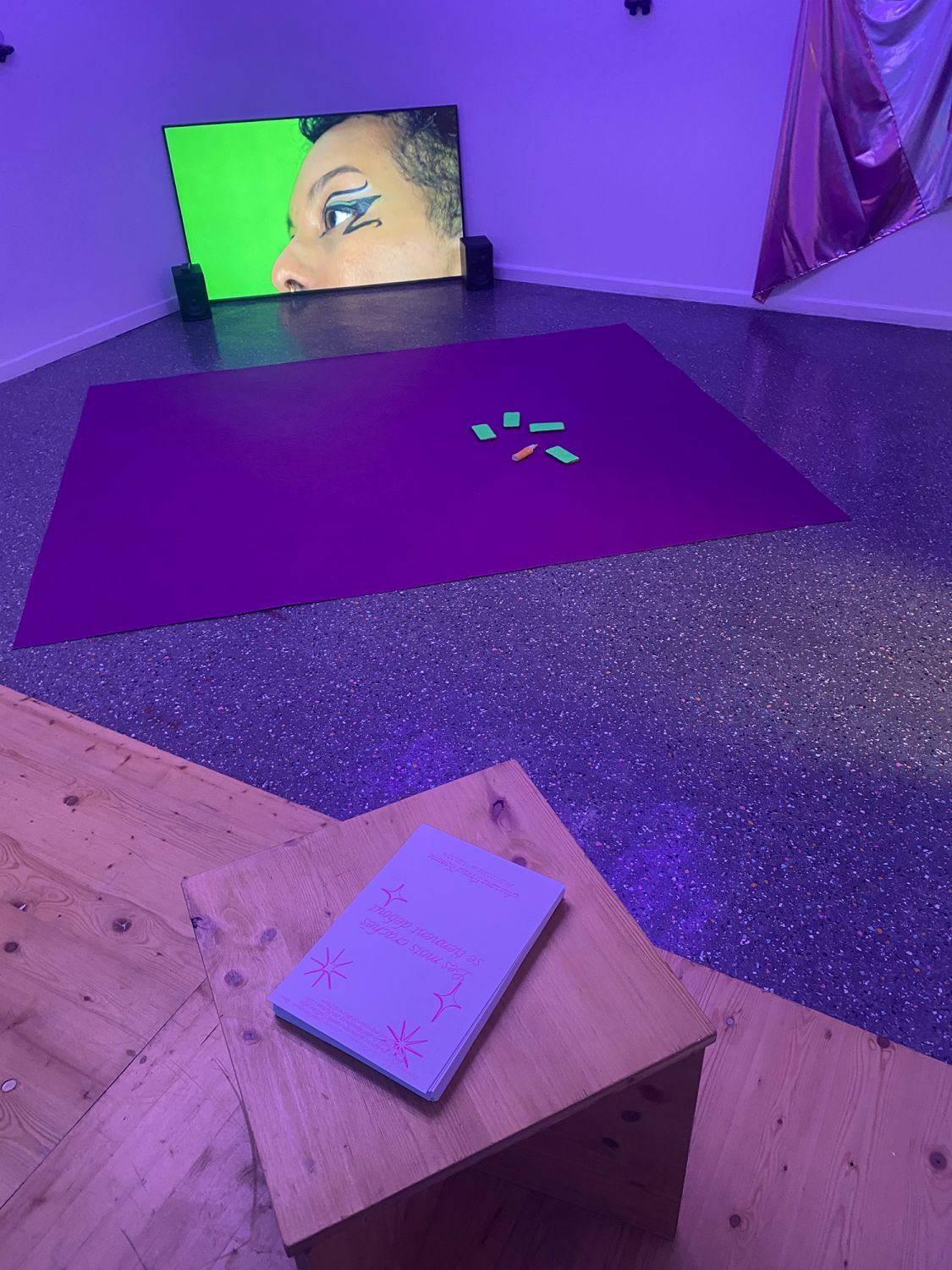 Tanaland ne représente pas seulement une utopie : c’est avant tout un acte de reprise symbolique, un renversement du stigmate, selon la formule sociologique consacrée. L’artiste traduit ce geste à travers une série de sculptures en verre soufflé aux couleurs vives, posées sur des supports en céramique noire. Quatre insultes misogynes — TANA, SALOPE, CONNE, PUTE et CONNASSE — sont soufflées lettre par lettre dans des formes arrondies en verre, réalisées avec l’aide de l’artisteHeloïse Colrat. Sous les souffles d’Auriane, ces formes se tordent et se métamorphosent, devenant de véritables empreintes matérielles d’un processus de transformation symbolique. C’est comme si ces mots hostiles se vidaient de leur substance, de toute leur charge négative, jusqu’à devenir un souffle pur, sorte de langage avant le langage. Les mots cessent alors d’obéir au sens, et affectent le corps pour devenir une expérience sensorielle libératrice.