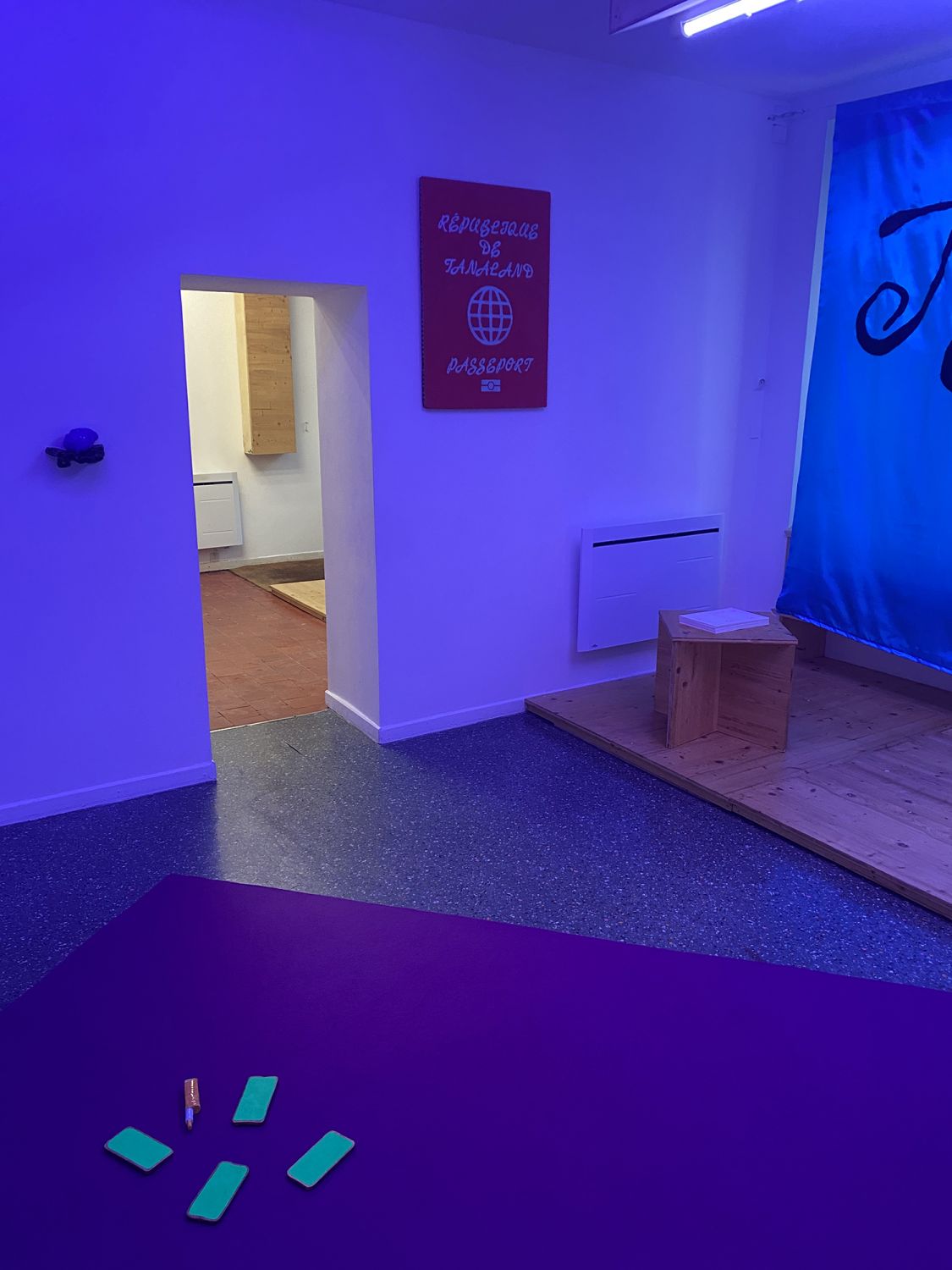 Dans Tanaland, on suit quatre jeunes femmes — Elea Le Henaff, Gabrielle Saïd, Juliana Dos Santos Quaresma et Prisca Enata —traversant la ville d’Annemasse. Lassées des remarques sexistes quotidiennes, elles partent, sur les conseils d’Hadja, à la recherche du pays Tanaland, doté de son propre passeport et de son drapeau.Dans une ville réelle, rythmée par les travaux de réaménagement et le bruit, elles projettent leurs désirs et plantent le décor d’un pays idéal, guidé par la liberté et la sororité. Grandeur, tapis rouge, fontaines, piscine… Peu à peu, leur imaginaire de Tanaland, entre glamour et dérision, vient se télescoper avec celui de la montagne qu’elles atteignent à la fin de la vidéo : le mont Salève, dominant Annemasse. Auréolé de légendes et de récits populaires, le Salève convoque un tout autre horizon d’émancipation, celui des communautés alternatives qui, au fil du temps, ont cherché dans la montagne des formes de vie libres. Dans un second temps, le phénomène Tanaland a aussi été exploré avec les étudiant·e·s du DNMADE design d’objet de l’ÉSAAB, au sein duquel un projet vidéo et de décors a été réalisé.